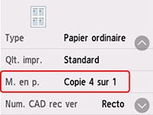 Sélectionnez Paramètres dans l'écran d'attente de copie pour afficher l'écran des paramètres d'impression. Sélectionnez Copie 4 sur 1 dans M. en p., puis sélectionnez OK.