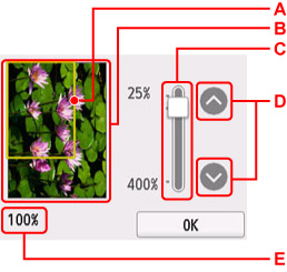 C:プレビュー画面を表示するときに設定しているコピー倍率が表示されます。[自動変倍]以外を選んでいるときは、ドラッグするとコピー倍率を変更することができます。