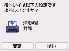 表示された用紙のサイズと種類が、後トレイにセットした封筒と同じであれば[はい]を選ぶ