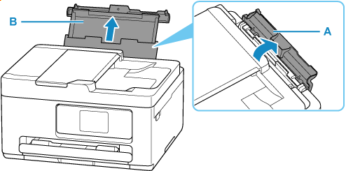افتح غطاء الدرج الخلفي (A)، ثم اسحب دعامة الورق (B).