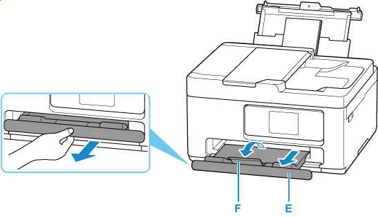 اسحب درج إخراج الورق (E) وامتداد درج الإخراج (F) إلى الخارج.