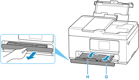 7. Trek de papieruitvoerlade (G) en het verlengstuk van de uitvoerlade (H) uit.