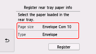 Επιλέξτε το μέγεθος και τον τύπο των φακέλων που τοποθετήσατε στην πίσω θήκη στις ρυθμίσεις Μέγ.σελ. (Page size) και Τύπος (Type), και, στη συνέχεια, πατήστε το Καταχώριση (Register).