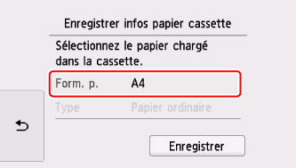 Une fois que vous avez inséré la cassette dans l'imprimante, l'écran d'enregistrement des informations sur le papier pour la cassette s'affiche sur l'écran tactile.