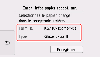 Une fois que vous avez fermé le couvercle de la fente d'alimentation, l'écran d'enregistrement des informations sur le papier pour le réceptacle arrière s'affiche sur l'écran tactile.