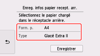 Une fois que vous avez fermé le couvercle de la fente d'alimentation, l'écran d'enregistrement des informations sur le papier pour le réceptacle arrière s'affiche sur l'écran tactile.