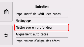 Si le nettoyage standard de la tête d'impression ne permet pas d'améliorer la qualité d'impression, procédez à un nettoyage en profondeur de la tête d'impression. Le nettoyage en profondeur de la tête d'impression requiert une plus grande quantité d'encre qu'un nettoyage normal de la tête d'impression : vous ne devez donc nettoyer la tête d'impression qu'en cas d'absolue nécessité.