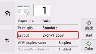 Válassza a Beállítások (Settings) elemet a másolás készenléti képernyőjén, és a nyomtatási beállítások képernyőjén válassza a 2->1 másolás (2-on-1 copy) lehetőséget az Elrendez. (Layout) elemnél.