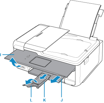 Aprire il pannello dei comandi (I), estrarre il vassoio di uscita della carta (J) e il supporto di uscita della carta (K), quindi aprire l'estensione del vassoio di uscita (L).