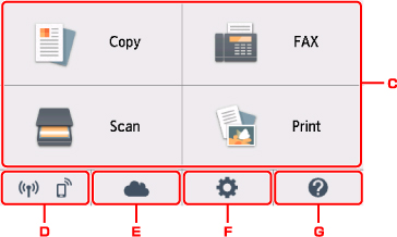 Atidaromas pagrindinis debesies ekranas. Galima naudotis „PIXMA/MAXIFY Cloud Link“ paslaugomis.