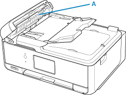 3. Use o pano para remover a poeira de papel da parte interna da tampa do alimentador de documentos (A).