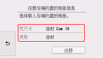 在页尺寸和类型中选择装入后端托盘的信封尺寸和类型,然后选择注册。