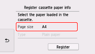 Изберете размера и типа на заредената хартия в касетата в Раз.стр. (Page size), след което изберете Регистриране (Register).