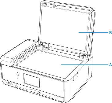 Använd en mjuk, ren, luddfri och torr trasa. Torka försiktigt av glasskivan (A) och insidan av dokumentluckan (den vita ytan) (B). Kontrollera att inga rester finns kvar efter rengöringen, i synnerhet inte på glasskivan.