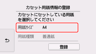 カセットにセットした用紙に合わせて[用紙サイズ]を設定し、[登録]を選ぶ