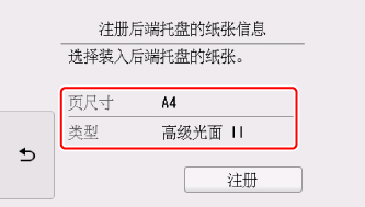 在页尺寸和类型中选择装入后端托盘的纸张尺寸和类型,然后选择注册。