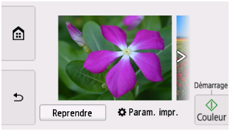 Sélectionnez Reprendre pour reprendre la lecture du diaporama pendant l'impression. Si l'impression n'est pas terminée, vous pouvez imprimer la photo affichée en mettant de nouveau le diaporama sur pause et en touchant Couleur.
