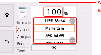 Vous pouvez éventuellement spécifier le niveau d'agrandissement ou sélectionner une copie en fonction d'un pourcentage prédéfini ou de l'échelle du papier.
