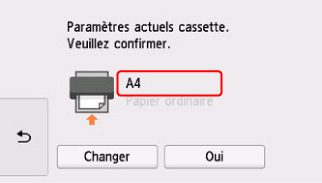 Une fois que vous avez inséré la cassette dans l'imprimante, l'écran de confirmation des paramètres du papier pour la cassette s'affiche sur l'écran tactile.