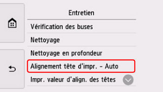 Pour imprimer et vérifier les valeurs de réglage actuelles de la position de la tête d'impression, sélectionnez Impr. valeur d'align. des têtes sur l'écran Entretien.