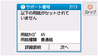 - 印刷やコピーするときに指定した用紙設定を変更する場合に選びます。用紙設定を変更して印刷やコピーをやり直してください。
