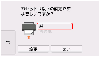 表示された用紙のサイズが、カセットにセットした用紙と同じであれば、[はい]を選びます。