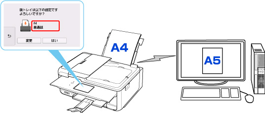 表示された用紙のサイズと種類が、後トレイにセットした用紙と同じであれば、[はい]を選びます。