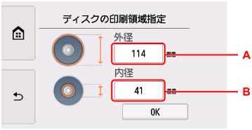 外径/内径の寸法は、プリンタブルディスクのパッケージやケース内のインデックスシートに記載されている印刷可能範囲(最小内径、最大外径)を確認するか、または印刷面の外径/内径を実際に測り、外径には計測した値より小さい数値を、内径には計測した値より大きい数値を指定してください。