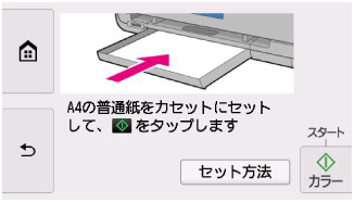 表示される案内に従って、A4サイズの普通紙をカセットにセットする