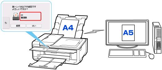 - 例えば、印刷やコピーするときの用紙サイズの設定がA5サイズで、給紙時にA4サイズと設定していた場合、後トレイまたはカセットの用紙をA5サイズの用紙に交換してから印刷またはコピーします。