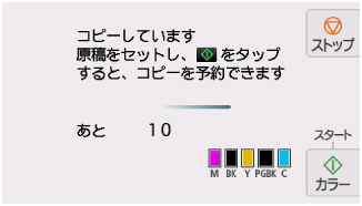原稿の読み取り中に[コピーを予約できませんでした 最初からやり直してください]と表示された場合は、[OK]を選んでから、[ストップ]をタップし、いったんコピーを中止してください。そのあと、コピーできなかった原稿からコピーし直してください。