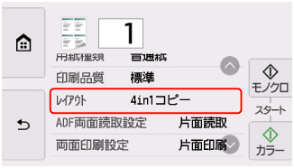 コピー待機画面で[印刷設定]を選んで印刷設定画面を表示し、[レイアウト]で[4in1コピー]を選んで、[OK]を選びます。