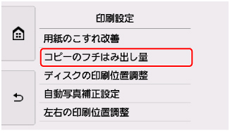 ここでは、コピーのフチはみ出し量を設定する操作を例に、本体設定画面の設定変更の手順について説明します。