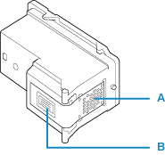 • Rør ikke ved de elektriske kontakter (A) eller printhoveddysen (B) på en FINE-patron. Printeren udskriver muligvis ikke korrekt, hvis du rører ved dem.
