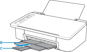 Τραβήξτε έξω τη θήκη εξόδου χαρτιού (B) και την προέκταση θήκης εξόδου (C).