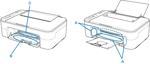 قبل استبدال خرطوشة FINE، نوصي بتنظيف إطار فتحة إخراج الورق (A) أو الجزء الداخلي من الغطاء (B) باستخدام قطعة قماش ناعمة ومبللة.