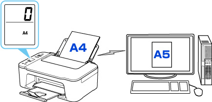- Jei spausdinant arba kopijuojant taikomas popieriaus formato parametras yra A5, o LCD ekrane nustatytas popieriaus formato parametras A4, spausdintuvas spausdins taikydamas A5 kaip įdėto popieriaus parametrą.