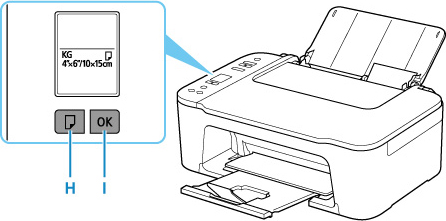Vajutage nuppu Paberi valimine (Paper Select) (H), valige paberi suurus vastavalt tagumisele alusele laaditud paberile ja seejärel vajutage nuppu OK (I).