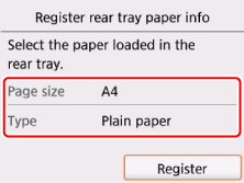 Uždarius tiekimo angos dangtį, LCD atidaromas popieriaus informacijos registracijos ekranas. Pasirinkite Psl. form. (Page size) nuostatą A4 arba Letter ir Tipas (Type) nuostatą Papr. popierius (Plain paper), tada pasirinkite Registruoti (Register).
