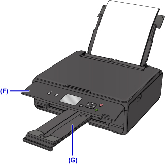 Atidarykite valdymo skydelį (F) ir ištraukite popieriaus išvesties dėklą (G).