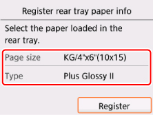 6. Nustatydami Psl. form. (Page size) ir Tipas (Type) nuostatas pasirinkite į galinį dėklą įdėto popieriaus formatą ir rūšį, o tada pasirinkite mygtuką Registruoti (Register).