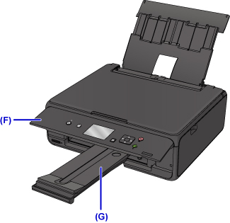 7. Atidarykite valdymo skydelį (F) ir ištraukite popieriaus išvesties dėklą (G).