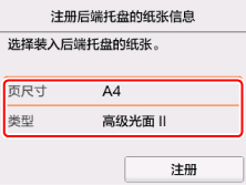 6. 页尺寸类型中选择装入后端托盘的纸张尺寸和类型,然后选择注册