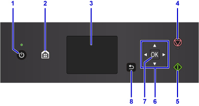 - (1) Mygtukas Įjungti (ON) / Lemputė MAITINIMAS (POWER)