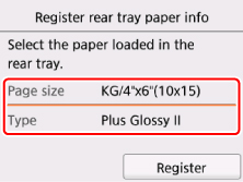 Επιλέξτε το μέγεθος και τον τύπο του χαρτιού που τοποθετήσατε στην πίσω θήκη στις ρυθμίσεις Μέγ.σελ. (Page size) και Τύπος (Type), και, στη συνέχεια, πατήστε το Καταχώριση (Register).