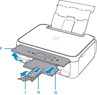 7. Nyissa ki a kezelőpanelt (F), húzza ki a papírgyűjtő tálcát (G) és a papírkimeneti támaszt (H), majd nyissa ki a papírgyűjtő tálca hosszabbítóját (I).