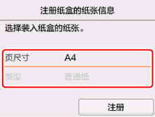 推回纸盒后,LCD屏幕上显示纸张信息注册屏幕。 将页尺寸选择为A4或Letter,然后选择注册。