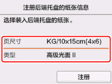 6. 页尺寸类型中选择装入后端托盘的纸张尺寸和类型,然后选择注册