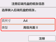 在页尺寸和类型中选择装入后端托盘的纸张尺寸和类型,然后选择注册。