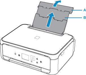 Arka tepsi kapağını (A) açın ve ardından kağıt desteğini (B) yukarı doğru çekin.